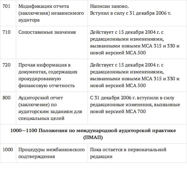 Международные аудиторские стандарты предусматривают описание основных критериев, принципов и процедур, которые должны соблюдаться всеми аудиторами при осуществлении аудиторских проверок вне зависимости от условий и целей аудита. Они носят рекомендательный характер. Аудитор имеет возможность отступления от данных норм, в случаях когда это необходимо для более эффективного достижения целей аудита.