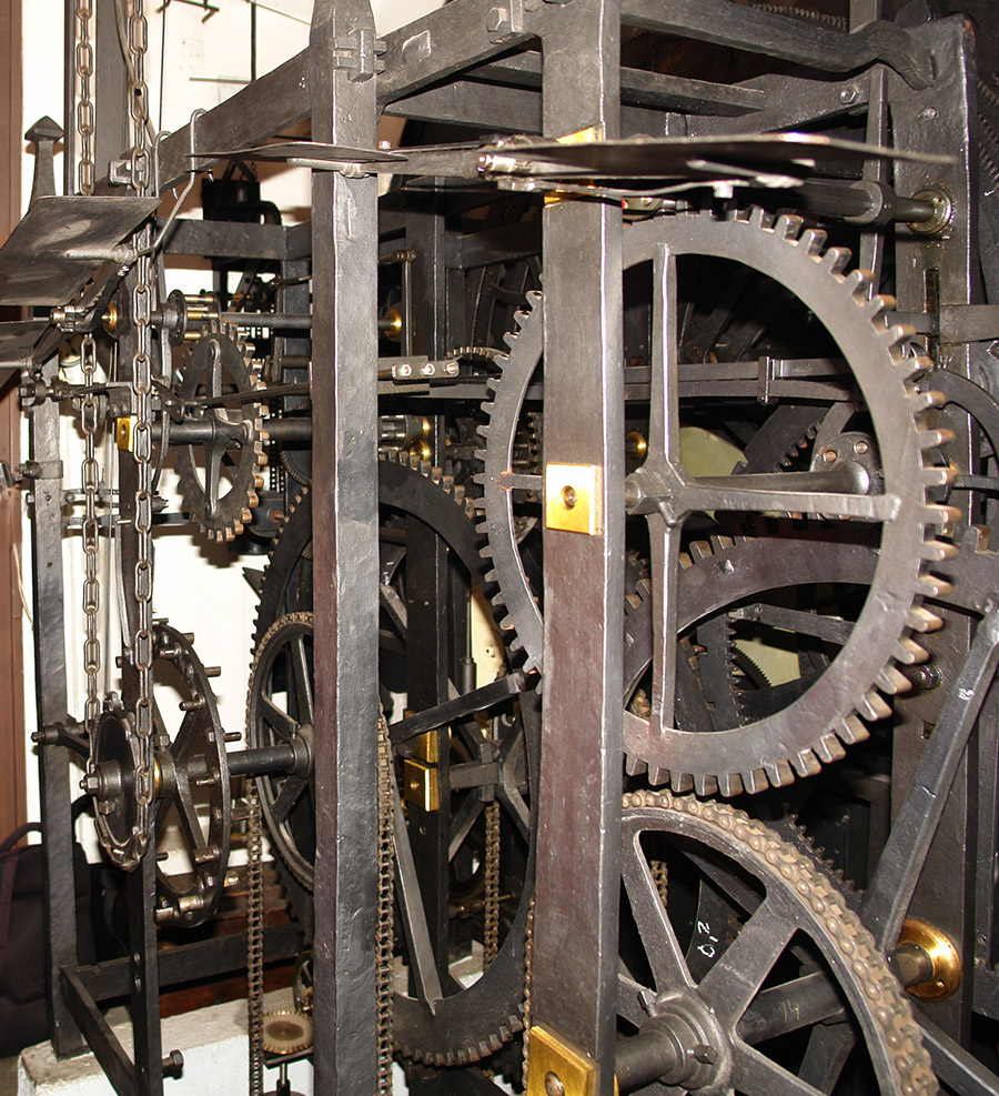 За коваными железными дверями лестница ведет к часовому механизму, отмеряющему тяжелым неумолимым шагом минуты, часы, дни и годы нашей жизни. Время от времени глухо проворачивается его старинный механизм, отстукивают защелки на храповиках. Эти астрономические часы должны были сообщить миру о времени прихода Люцифера. Создатель часов попытался их уничтожить, просил у Бога защиту от мести сатаны. В борьбе Божья сила вынуждена была уступить сатанинской. Часы ожили и продолжали отмерять время.