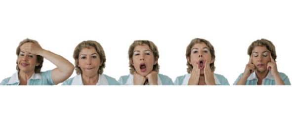 сцепленные пальцы рук положить на лоб, легонько надавить, а брови поднять как можно выше, преодолевая сопротивление век. Мышцы напряжены 5 секунд. Затем руки опустить, расслабится. Повторяют 5 раз.