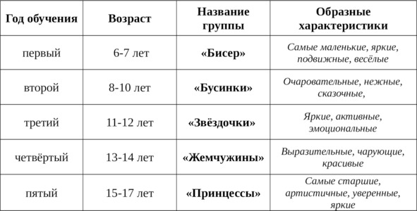 Программа, срок реализации которой рассчитан на 5 лет, охватывает детей от младшего до старшего школьного возраста. Специфика деления на возрастные группы в восточном танце заключается не только в особенностях физиологии и анатомии на каждом возрастном этапе, но и в психологической составляющей. Каждая маленькая девочка, приходящая на занятия восточным танцем хочет быть принцессой, получать похвалу и восторженные взгляды зрителей. Уже в этом возрасте закладывается стремление быть красивой, нравиться окружающим. Яркий костюм, причёска, самый первый, детский макияж – даёт ощущение праздника, удовольствия от танца. Чем старше становиться ребёнок, тем более осознанным становятся эти ощущения и восприятия себя как личности.