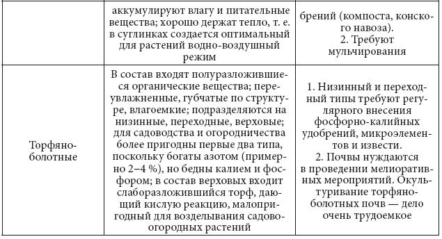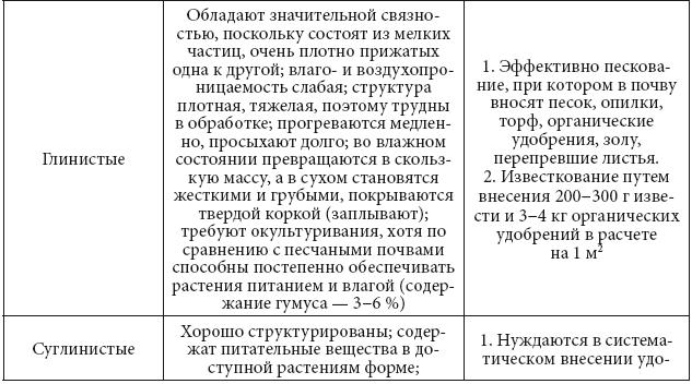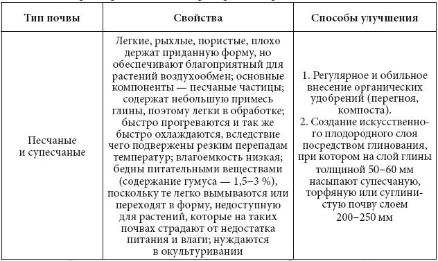 В России встречаются дерново-подзолистые, серые лесные почвы и чернозем, причем садовые участки чаще всего лежат в зоне первых, которые, в свою очередь, по механическому составу (основание для этого – количественное соотношение глинистых и песчаных минеральных частиц, содержащихся в почве размером менее 0,01 мм и более 1 мм соответственно) классифицируются на песчаные, супесчаные, глинистые, суглинистые, торфяные (табл. 1).