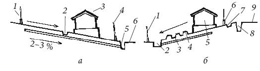 б – при уклоне рельефа в направлении от дороги: 1 – ограда; 2 – водосборник; 3 – канава; 4 – грядки; 5 – дом; 6 – ограда; 7 – канава; 8 – уличный кювет; 9 – дорога