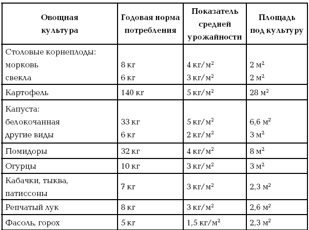4. Сажайте исключительно те овощи, которые были запланированы. При этом вам надо вычислить, сколько и каких культур сажать, сколько гряд подготовить. Главный критерий – потребности вашей семьи. Кроме того, надо учесть и такой момент: сколько человек в вашей ячейке общества (ведь понятно, что для одного-двух человек потребуется меньше овощей, чем для шести-семи), а также урожайность тех или иных огородных культур с единицы площади (табл. 6).