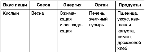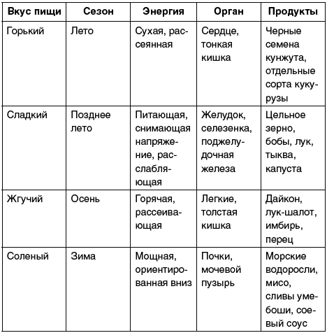 Вкус представляет собой еще одну форму жизненной силы. В восточной традиции он ассоциируется с сезоном, в котором данная пища является преобладающей, с энергией – согревающей или охлаждающей, с органом, для которого она служит источником питания и благотворного влияния. Все это наглядно показано в табл. 4.
