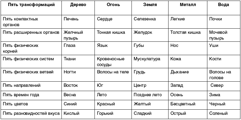Кроме того, энергия одного и того же продукта в зависимости от кулинарной обработки может меняться с холодной на теплую. Так, если нагреть соль, то воздействие, которая она окажет на организм, будет согревающим, в то время как в холодном виде она дает охлаждающий эффект. Имеют значение добавки, время и способ приготовления пищи. Они также могут радикально изменить качество энергии. Вкус, цвет, температура – это составляющие всеобщего цикла, известного под названием «Пять трансформаций». А. Куши и А. Джек представили их в виде перечня (табл. 5).