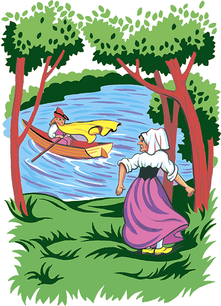 – Здесь нельзя, – сказала ведьма, – но вы получите пищу и крышу над головой во дворце на том берегу. Плывите туда, но этого мальчишку оставьте у меня: у меня найдётся работа для него, хотя что-то мне подсказывает – он шустрый и хитрый и доставит мне кучу неприятностей.