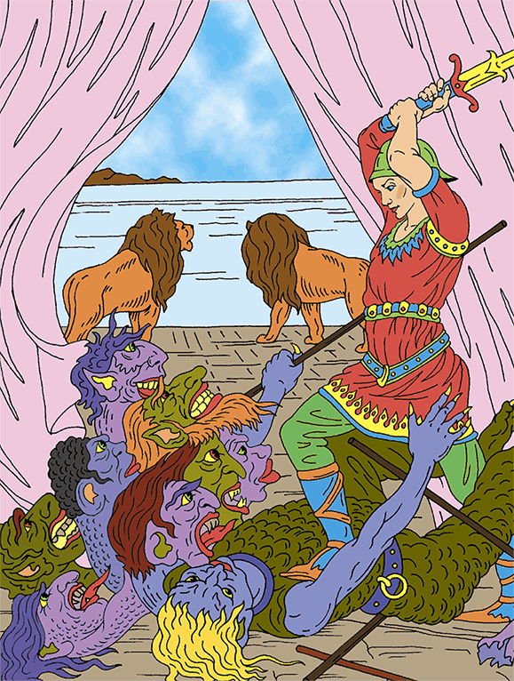 Тогда принцесса заставила его выпить волшебного напитка и указала на огромный меч тролля. В это мгновение дверь распахнулась, и на пороге появился отвратительный тролль, еще более ужасный, чем два первых.