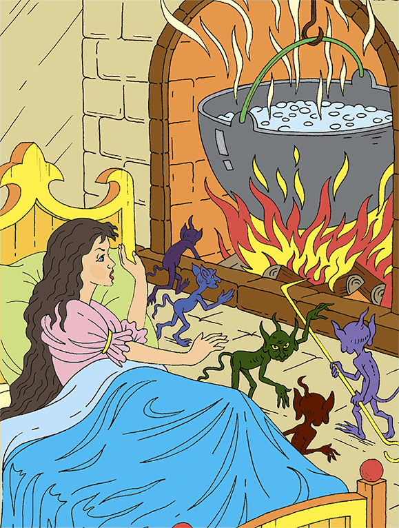 Когда на землю опустилась ночь, девушка легла на золотую кровать, но заснуть не могла, хотя глаза ее и были закрыты. В полночь, к своему ужасу, она услышала в коридоре чьи-то шаги, приближающиеся к ее комнате. Через мгновение дверь отворилась, и комнату заполнило множество странных существ. Не обращая внимания на принцессу, они развели огонь в огромном камине и поставили на него большой котел с водой. Когда вода закипела, злые тролли (а это были они) с диким визгом кинулись к бедной девушке и принялись стаскивать принцессу с постели. Когда тролли подтащили ее к кипящему котлу и стали пытаться затолкнуть ее туда, бедная девушка чуть не умерла от страха, но не вымолвила ни звука, лишь молча, из последних сил сопротивляясь гадким уродцам. Наконец раздался крик петуха, и все злые духи исчезли.