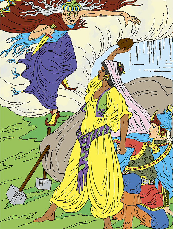 Тем временем чернокожая девушка и принц побежали к реке, лежавшей на границе владений колдуньи. Они не преодолели еще и половины пути, как снова земля задрожала. Колдунья догоняла их, изрытая страшные проклятия.