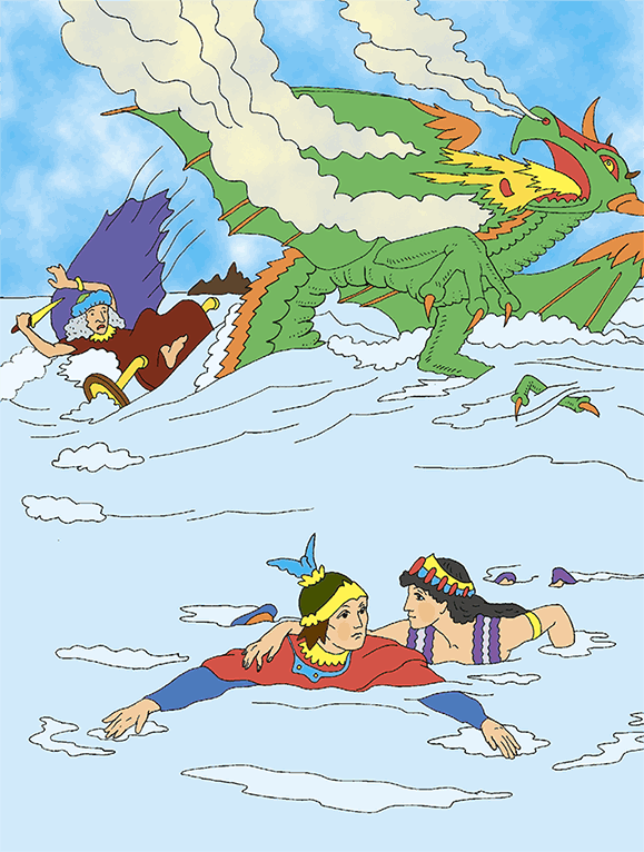 В это время злая колдунья села в свою повозку, запряженную огнедышащим драконом, и полетела по воздуху вслед за ними. Но, добравшись до берега реки, она увидела, что двое влюбленных плывут по волнам легко, как две рыбки.