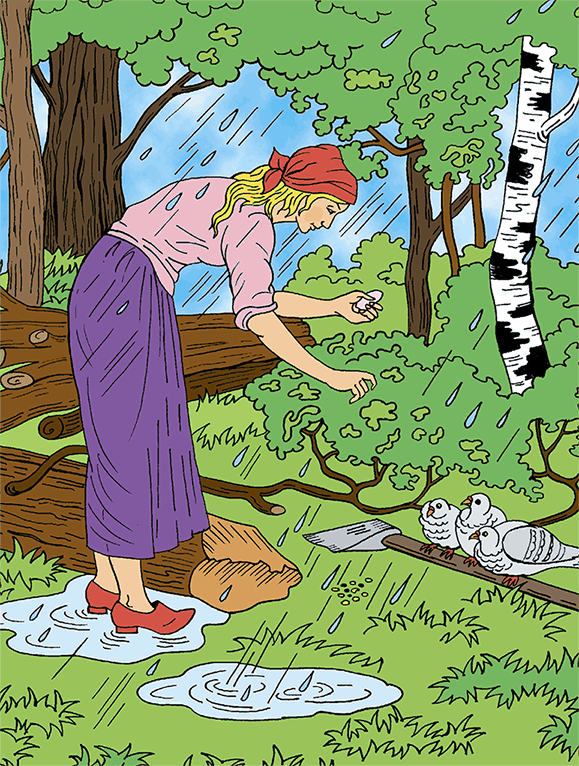 – Бедняжки, – сказала девушка, погладив их, – почему вы сидите здесь под дождем? Летите домой, в свое гнездо, но сначала подкрепитесь этим хлебом, который я припасла себе на ужин. Может быть, тогда вы почувствуете себя лучше. Вы сидите на топоре моего отца, мне нужно как можно скорее отнести его домой, иначе меня накажет моя мачеха.