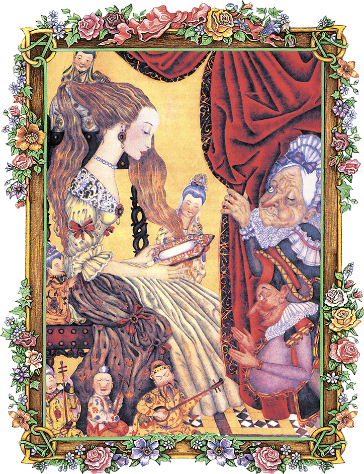 – Ваше величество, – сказали они, – не плачьте. Мы обещаем вам, что в один прекрасный день ваша дочь станет счастливейшей девушкой на свете. – Королева, подумав, решила, что счастье всё-таки лучше, чем красота, и утешилась.