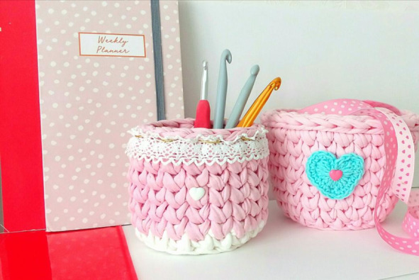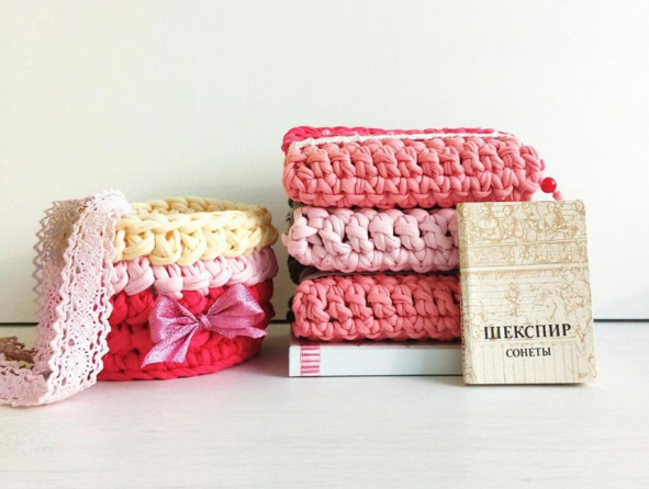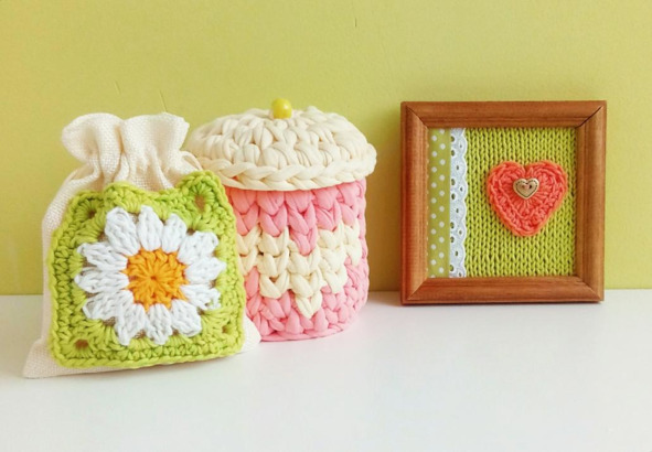 Корзины для хранения нужных вещей, корзины для праздничных подарков и пасхальных яиц, скатерти на чайные столы, салфетки, подушки, пледы, блокноты для лирики, сумочки, косметички, мешочки для хранения, мотивы «бабушкин квадрат», декоративное панно, вязаные тыковки, сказочные домики, бабочки, листочки, елочки, рыбки, ракушки, подвески (звезды, снежинки, сердечки, цветы, спасательный круг) и другие элементы. Объемная вышивка: цветы и травы, листья, грибы («Ботаника», «Розы»), бабочки, велосипед с цветами, снежинки, елочки, новогодние игрушки и другое.