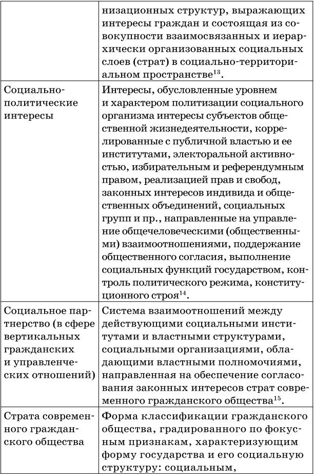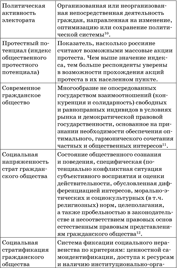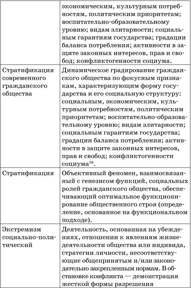 В ходе подготовки монографии авторами был разработан категориально-понятийный аппарат, который в развернуто представлен в научно-практическом словаре-справочнике «Проблемы согласования интересов страт современного гражданского общества России» [33]. Издание содержит методические и методологическими разделы и имеет практическую значимость для социологической диагностики процесса социальной и политической стратификации в регионах Российской Федерации.