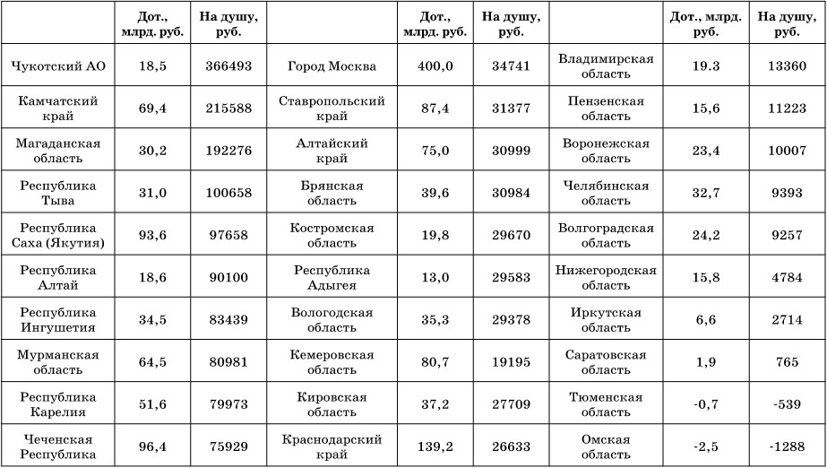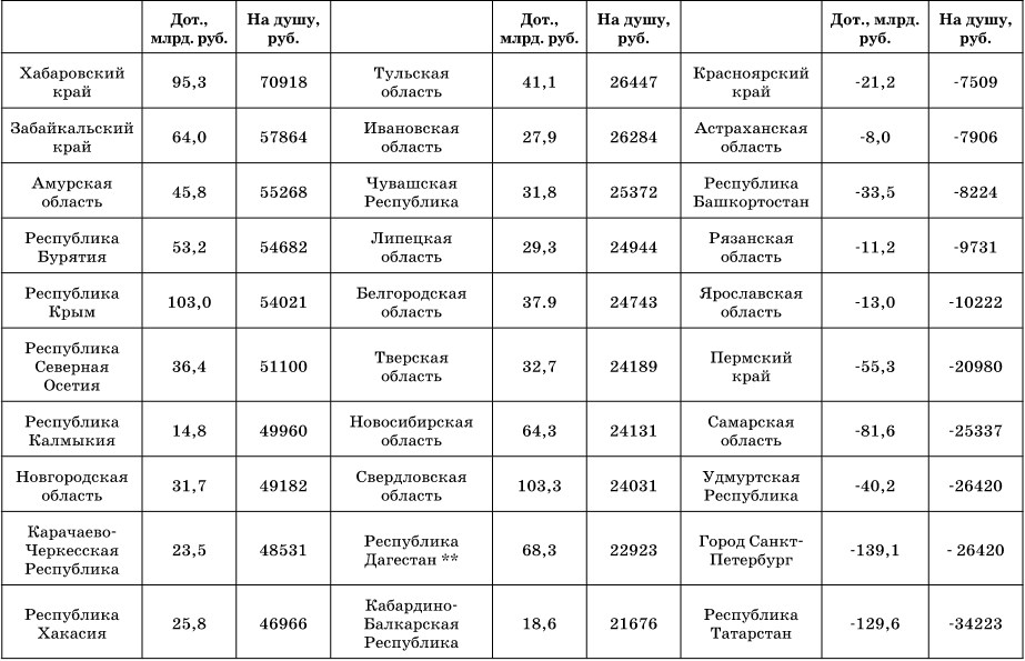 В целом по России 20 регионов-доноров, но в три раза больше- 64-ррегинов дотационных. Дотационные регионы – это субъекты Российской Федерации, получающие денежные средства из федерального бюджета без необходимости их возврата на безвозмездной основе. Крупными дотационными регионами являются Краснодарский край, Дагестан, Чечня, Ростовская область, Свердловская область, Крым с Севастополем, Якутия, Приморье и Хабаровский край – почти весь Юг и Дальний Восток (таблица 1).