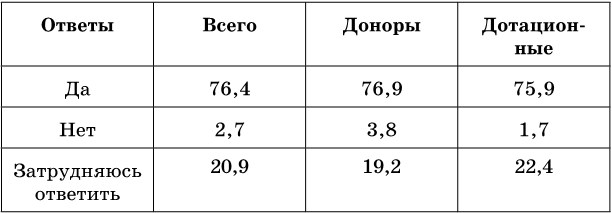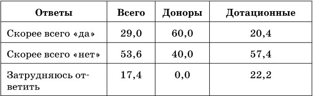 Во-первых, позиции экспертов донорских регионов более четко и определенно выражены, чем в группе экспертов дотационных регионов, где 22% колеблющихся в своем ответе на поставленный вопрос. Во-вторых, у большинства представителей регионов-доноров (60%) преобладает оптимистический подход к такой перспективе, и они считают, что это «скорее всего, возможно». Среди экспертов дотационной группы позиция с точностью наоборот: «скорее всего нет» (57,4%). Когда происходит подобная поляризация оценок, это сигнализирует о том, что консолидации социальных интересов в таких условиях не происходит, а усиливается индивидуализация интересов и действий представителей разных групп социально-экономических интересов, отдельных личностей из сферы бизнеса и власти.