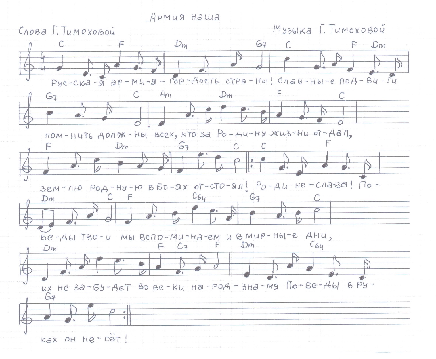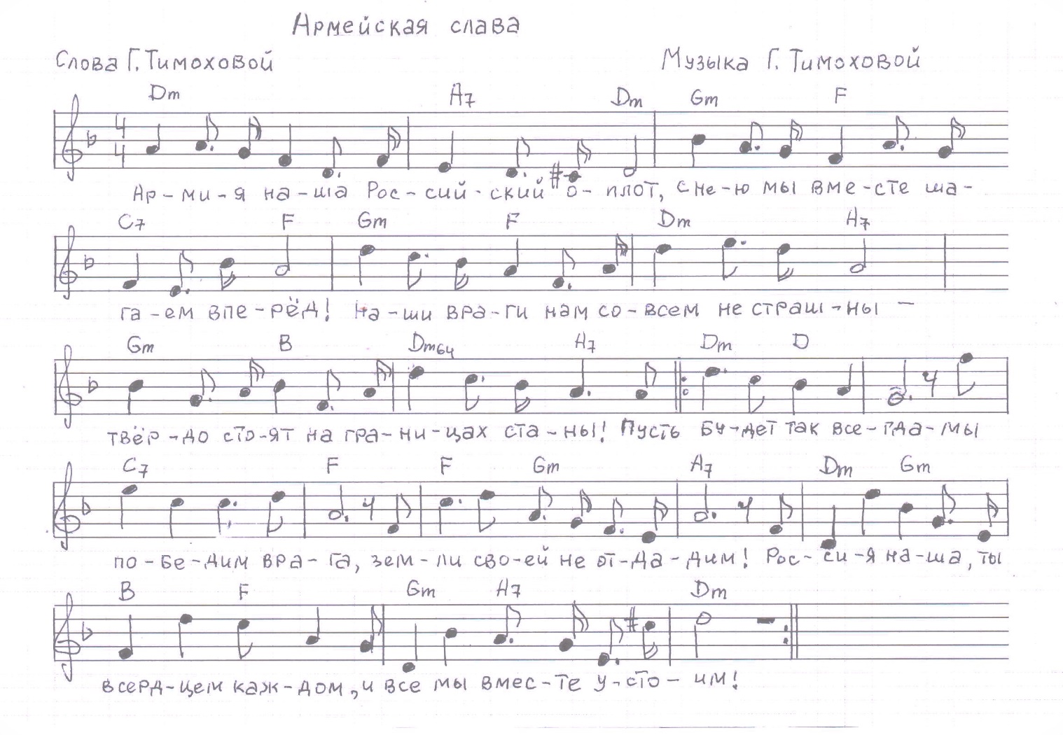 1.Армия наша – Российский оплот,С нею мы вместе шагаем вперёд,Наши враги нам совсем не страшны –Твёрдо стоит на границах страны!Припев:Пусть будет так всегда – мы победим врага,Земли своей не отдадим!Россия наша, ты в сердце каждом,И все мы вместе устоим!2.Армия наша за правду стоит,В памяти вечной победы хранит,И защищают Россию свою,Смело дерутся с врагами в бою!3.Храбрые воины нашей земли,Вы честь и славу свою сберегли,И не исчезнет российский народ,С вами за Родину гордо встаёт!