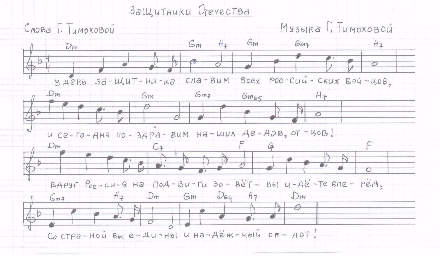 1.В «День защитника» славимВсех российских бойцов,И сегодня поздравимНаших дедов, отцов!Вдруг Россия на подвиги зовёт –Вы идёте вперёд,Со страной вы едины,Вы – надёжный оплот!2.И солдаты РоссииС честью службу несут!Нет сильнее их в мире,И враги не пройдут.И Победы проносят сквозь года -Не склонить никогда.В сердце вашем РоссияБудет жить навсегда.3.«На защиту мы встанемИ врагов победим,И Российское знамяГордо мы укрепим,И врагу никогда нас не сломить,Будем правде служить,Ведь Россия достойна,Чтобы в мире ей жить!»