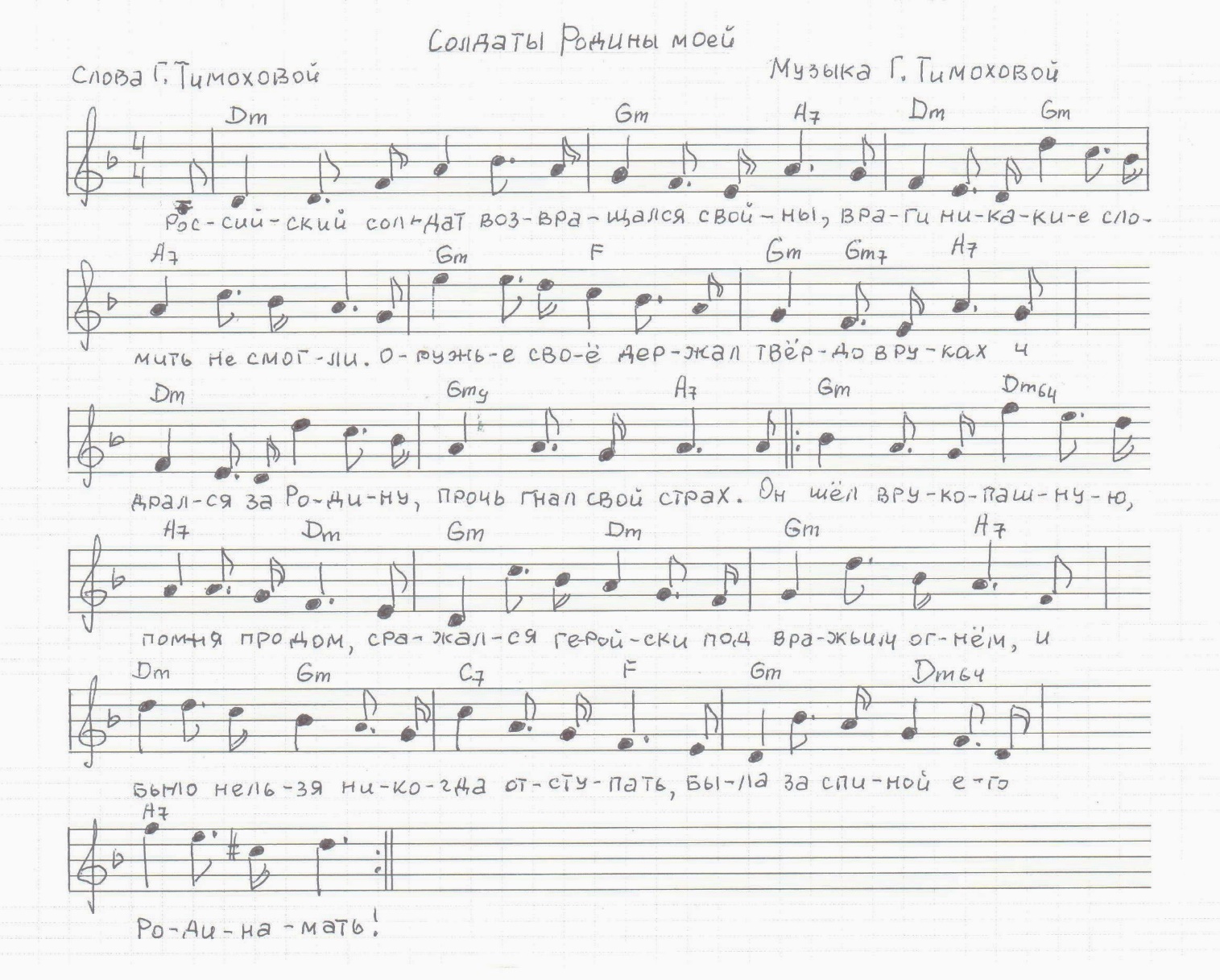 1.Российский солдат возвращался с войны,Враги никакие сломить не смогли.Оружье своё держал твёрдо в рукахИ дрался за Родину, прочь гнал свой страхПрипев.Он шёл врукопашную, помня про дом,Сражался геройски под вражьим огнём,Ведь было нельзя никогда отступать,Была за спиной его Родина-мать!2.В жестоких сраженьях пришлось побывать,Чтоб землю родную врагам не отдать.Ночами солдат не смыкал своих глаз:«Врага разгромить!» – получал он приказ.3.Историю нашу нельзя забывать –За правду всегда шёл солдат воевать,И воинской славой Россия горда,Её не забудет народ никогда!
