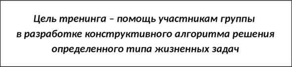 Понятно, что тренинг, построенный таким образом, с неизбежностью должен иметь совершенно конкретную тему (из числа тех проблем, с которыми клиенты обычно оказываются на приеме у психотерапевта) и столь же конкретную задачу.