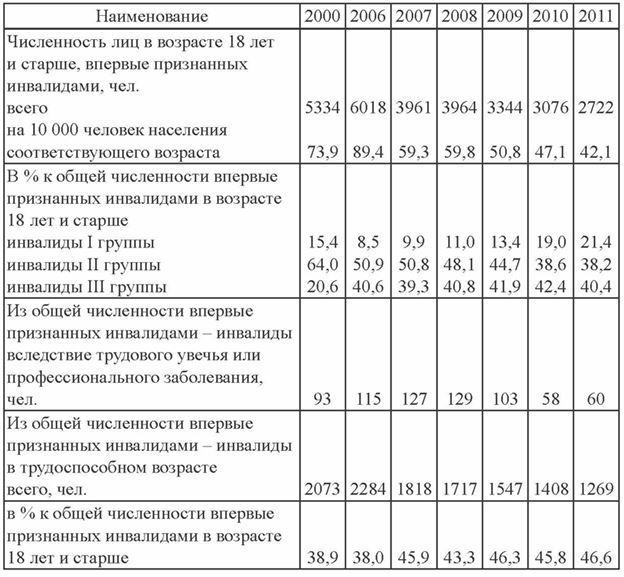 Причем, если в 2006 г. на 10 тыс. чел. соответствующего возраста приходилось 76,2 человек, впервые признанных инвалидами, то в 2011 г. – 37,5 чел. (табл. 1).