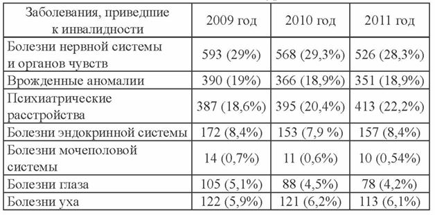 Информация о структуре по заболеванию, обусловившему развитие детской инвалидности в регионе за 2009-2011 гг., представлена в таблице (табл. 2).