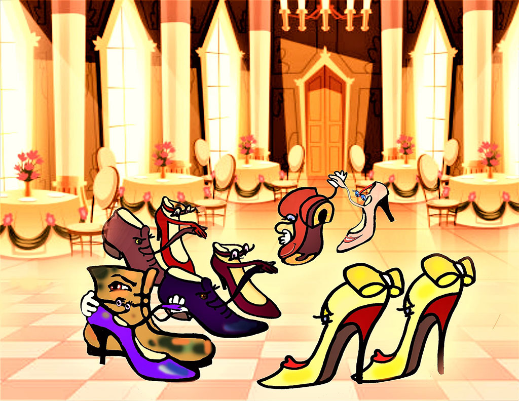 Как-то раз Башмачок попал на бал. Да-да, самый настоящий бал в самом настоящем дворце! Да не просто попал, а отплясывал так, что никто не мог устоять на месте! Весь дворец пустился в пляс! Как же так получилось, спросите вы. Да просто Башмачок по дороге нашел волшебные подковы и (сам еще не зная, что они волшебные)тут же нацепил их. А подковки те были плясовые, вот почему Башмачок всех заразил своим танцем!