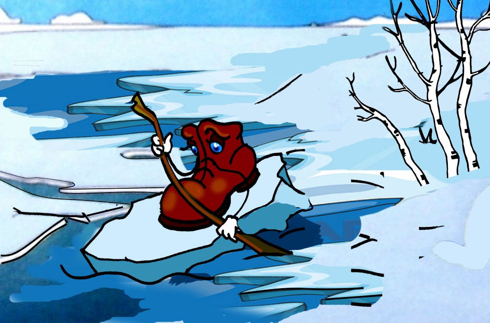 Однажды весной башмачок решил перейти через речку, чтобы сократить путь. Это было крайне неосторожно! Ведь лед был уже подтаявший, и башмачок в любую минуту мог провалиться в ледяную воду! Но Башмачок об этом не подумал… Он шел, весело напевая свою песенку и улыбаясь весеннему солнышку. Но вдруг лед под ним предательски затрещал. Трещины с каждой минутой увеличивались и расширялись. Вот уже Башмачок оказался на крохотном островке изо льда, а вокруг темнела вода. И хотя Башмачок знал, что не утонет, он всерьез испугался, что, отсырев, может совсем расклеиться. Башмачок отчаянно попросил небо о помощи, искренне раскаиваясь в своем легкомысленном поступке. Он горячо обещал больше никогда такого не делать. И – о, чудо! – из воды вынырнул обломок дерева. Башмачок поблагодарил небо, схватил этот обломок и что есть сил стал грести к берегу. Когда Башмачок, еле живой от усталости и страха, выбрался на берег, он твердо знал – весной лед некрепок! Ни в коем случае нельзя рисковать своей жизнью, доверившись ему и решив по нему перейти. Этот урок Башмачок запомнил на всю жизнь.