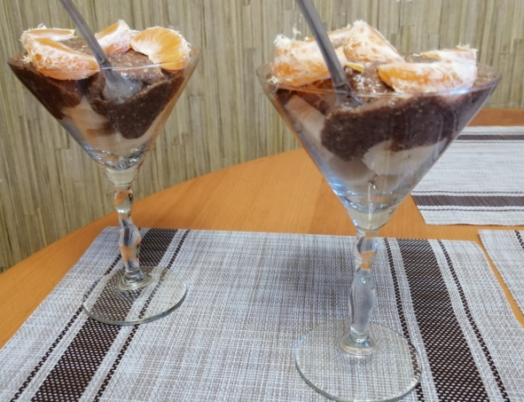 На завтрак я приготовила кашу из семян льна. Выложила её в бокалы для мартини. На дно положила нарезанные бананы, сверху украсила дольками мандарина. Начинаешь есть кашу с кисло-сладкими мандаринами, заканчиваешь сладкими бананами. Даже если каша на вкус показалась не очень, бананы это исправят и оставят приятное впечатление.