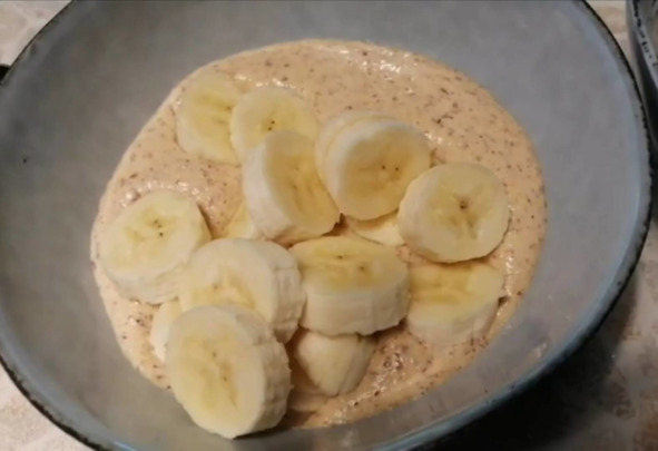 С вечера залила семена льна водой. Утром промыла лён холодной водой. Для этого лучше использовать мелкое ситечко, а то лён убежит. Он скользкий и мелкий. Добавила в лён немного холодной воды и измельчила в блендере в кашку. Выложила в бокалы для мартини банан, кашку, и сверху мандариновые дольки, чтобы завтрак смотрелся празднично. Получилось на каждую порцию по половинкам банана и мандарина.