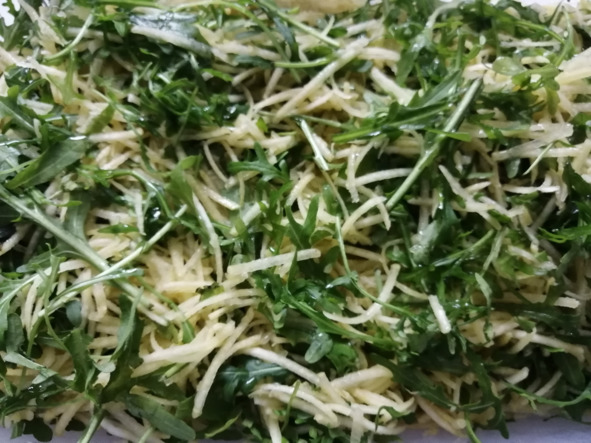 Репу потёрла на мелкой тёрке, добавила рукколу и оливковое масло.