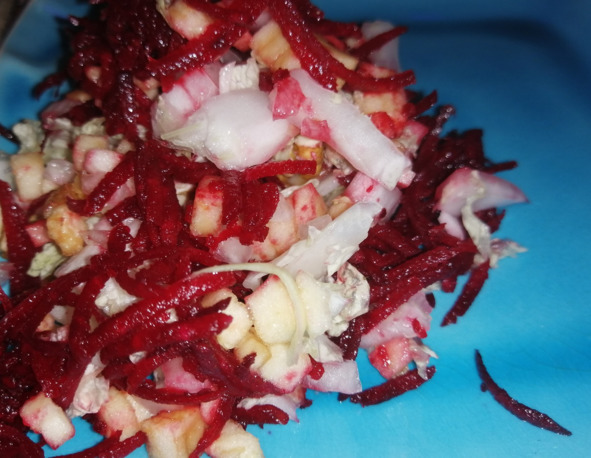 Сырую свёклу натёрла на крупной тёрке. Белокочанную капусту нашинковала, немного присолила, помяла, чтобы капуста дала сок и стала немного мягче.