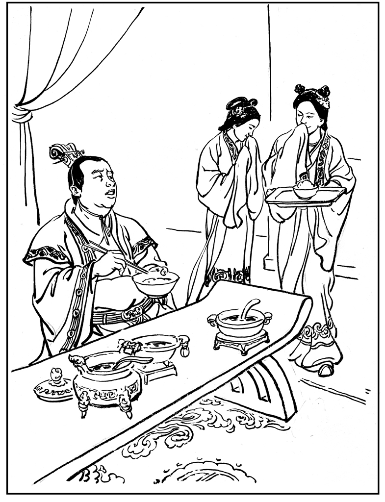 Аристократия и чиновники династии Цзинь прославились своим вниманием к одеяниям и яствам. Будь то представители старой аристократии или люди, ставшие знатными недавно, главным их умением было расточительство. Имеющий положительную репутацию в годы основания государства аристократ Хэ Цзэн к пожилому возрасту уже не мог довольствоваться абы какой одеждой и едой. Не описать словами красоты его одеяний и утонченности яств, которые были даже лучше, чем во дворце. На великолепное питание уходило десять тысяч монет ежедневно, что обычному крестьянину хватило бы на много дней А Хэ Цзэн еще и досадовал, что плохо питается, а ежели вкус блюда был не совершенен, то к пище он даже не притрагивался. Иногда взглянув на пищу, сразу говорил: «Ах! И места-то нет, чтобы начать трапезу». Он пресытился. Когда же его сын Хэ Шао стал чиновником, то его вкусы в еде стали еще более изощренными, а траты на ежедневное питание достигли двадцати тысяч монет. На его столе постоянно были все возможные деликатесы.