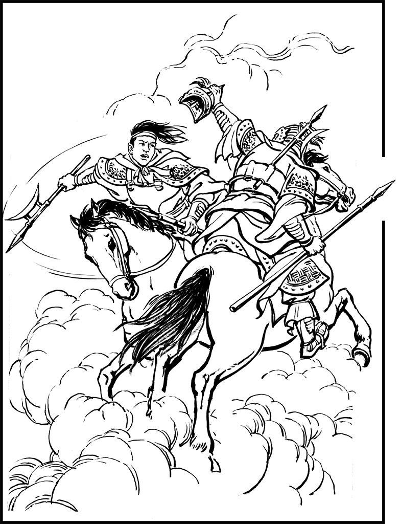 После долгой борьбы эти двое так и не определили победителя или проигравшего. Тайши Цы хотел привести Сунь Цэ к ровной поверхности, поэтому он развернулся и побежал назад. Сунь Цэ не мог отпустить его и сразу же погнался за ним. На ровной поверхности под хребтом Тайши Цы повернул голову своего коня и поднял ружье, чтобы выстрелить, как раз вовремя, когда Сун Цэ яростно выстрелил в его шпоры. Тайши Цы поспешно опустил голову и увернулся, но Сунь Цэ быстро вытащил из-за спины короткий меч. В этот момент Тайши Цы тоже повернулся и снял с Сунь Цэ шлем.
