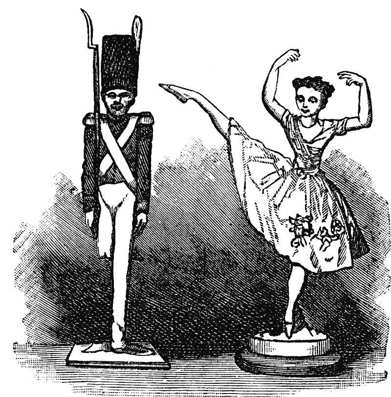 Вечером мальчик уложил солдатиков в коробку и пошел спать. За ним отправились на покой родители, а потом и слуги. Только что дом затих, игрушки пришли в движение и начали веселиться. Сначала они играли в жмурки, потом в войну и, наконец, вздумали танцевать. Солдатики в коробке задвигались; им тоже захотелось поплясать, но крышка была надвинута плотно, и они ее не осилили. А игрушки продолжали ходить ходуном. Паяц плясал трепака, грифель выделывал на грифельной доске разные выкрутасы. От этого шума проснулась канарейка и начала петь. Только картонная барышня и оловянный солдатик оставались неподвижными на своих местах.
