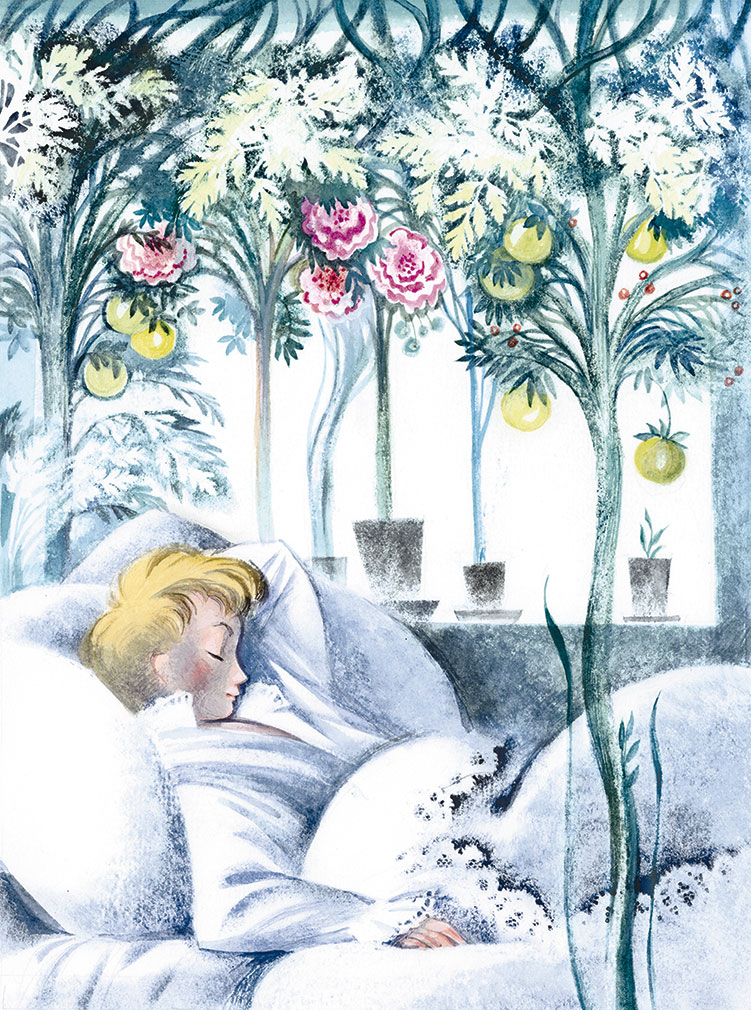 И вот все цветы́ в горшка́х мгнове́нно вы́росли, ста́ли больши́ми дере́вьями и протяну́ли свои́ дли́нные ве́тви к са́мому потолку́; ко́мната преврати́лась в чуде́снейшую бесе́дку. Ве́тви дере́вьев покры́лись цвета́ми; и ни оди́н цвето́к не уступа́л ро́зе в красоте́ и арома́те, а на вкус (е́сли бы то́лько вы захоте́ли