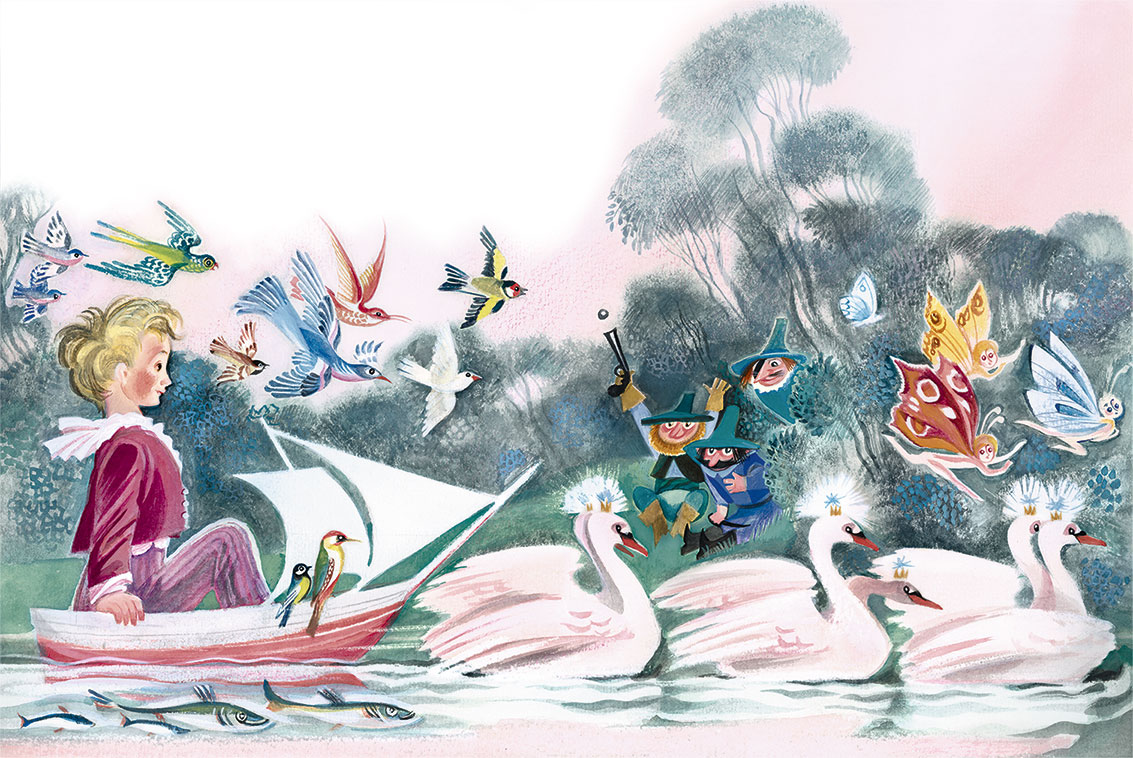 Зате́м О́ле приподня́л Я́льмара до у́ровня ра́мы, и ма́льчик ступи́л пря́мо в высо́кую траву́. Освещённый со́лнышком, сия́вшим сквозь листву́ дере́вьев, он побежа́л к воде́ и усе́лся в ма́ленькую ло́дку, кото́рая пока́чивалась на воде́ у бе́рега. Ло́дочка была́ вы́крашена в кра́сный и бе́лый цвет, а паруса́ её блесте́ли, как сере́бряные. Шесть лебеде́й в золоты́х коро́нах, наде́тых на ше́и, с сия́ющими си́ними звёздами на голова́х, повлекли́ ло́дочку ми́мо зелёных лесо́в, где дере́вья шепта́ли о разбо́йниках и ве́дьмах, а цветы́ – о преле́стных ма́леньких э́льфах и о том, что рассказа́ли им ба́бочки.