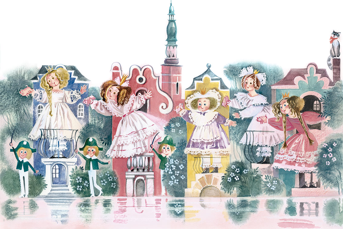 На берега́х реки́ возвыша́лись больши́е хруста́льные и мра́морные за́мки, а на балко́нах э́тих дворцо́в стоя́ли принце́ссы – и все они́ бы́ли знако́мые Я́льмару де́вочки, с кото́рыми он ча́сто игра́л, – они́ протя́гивали ему́ ру́ки, и ка́ждая держа́ла в пра́вой руке́ хоро́шенького са́харного поросёнка – тако́го ре́дко мо́жно купи́ть у торго́вки сла́достями. Я́льмар, проплыва́я ми́мо, хвата́л поросёнка, но принце́сса не выпуска́ла его́ из рук; поросёнок перела́мывался, и о́ба получа́ли свою́ часть: Я́льмар – побо́льше, принце́сса – поме́ньше. У всех за́мков стоя́ли на часа́х ма́ленькие при́нцы, они́ отдава́ли Я́льмару честь золоты́ми са́блями и осыпа́ли его́ изю́мом и оловя́нными солда́тиками – э́то я́вно бы́ли настоя́щие при́нцы!