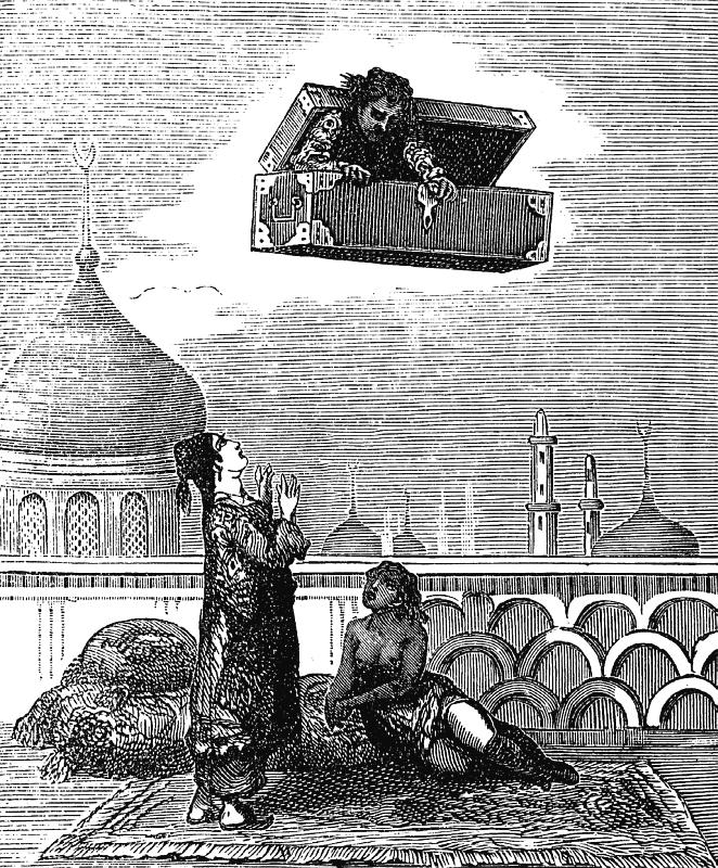 Сын купца, открыв чудесное свойство сундука, тотчас же улетел через камин к облакам; все летел да летел, а сундук трещал да трещал, и седок ожидал каждую минуту, что его экипаж развалится, а он сам полетит кувырком на землю. Однако ничего подобного не случилось. Путешествуя в сундуке, купчик благополучно прилетел в турецкую землю. Зарыв сундук в лесу, под сухими листьями, он пошел в город.