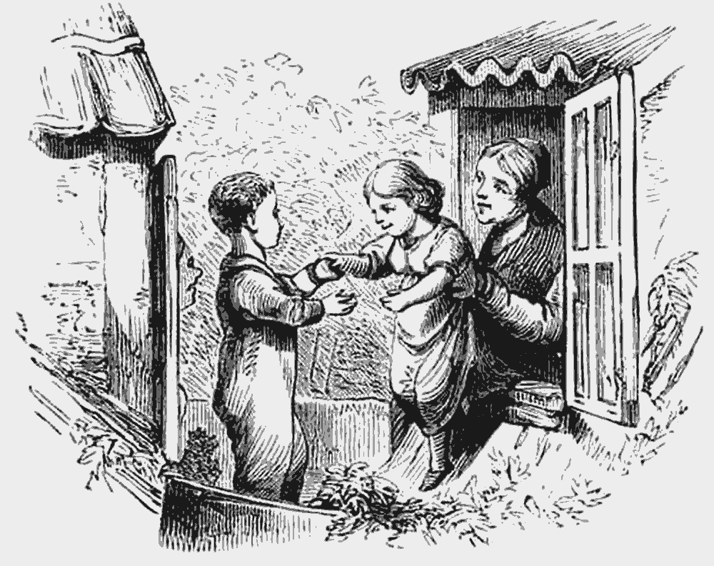 У родителей было по большому деревянному ящику; в них росли коренья и небольшие кусты роз, – в каждом по одному – осыпанные чудными цветами. Родителям пришло в голову поставить эти ящики поперёк желобов; таким образом, от одного окна к другому тянулись словно две цветочные грядки. Горох спускался из ящиков зелёными гирляндами, розовые кусты заглядывали в окна и сплетались ветвями; образовалось нечто вроде триумфальных ворот из зелени и цветов. Так как ящики были очень высоки, и дети твёрдо знали, что им нельзя карабкаться на них, то родители часто позволяли мальчику с девочкой ходить друг к другу по крыше в гости и сидеть на скамеечке под розами. И что за весёлые игры устраивались у них тут!