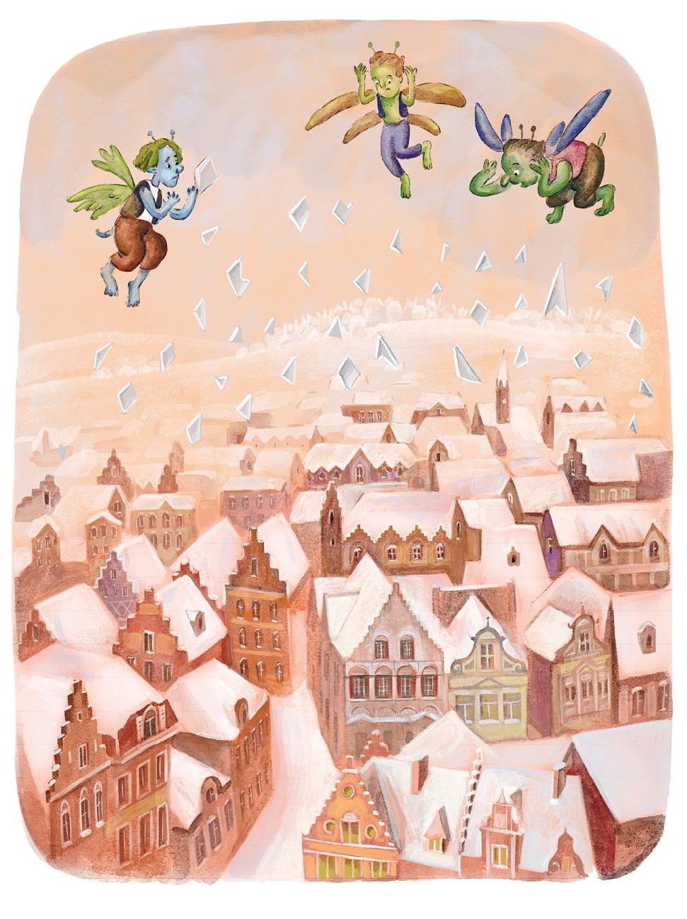 И вот они принялись носиться по свету с этим зеркалом; и скоро не осталось ни страны, ни человека, которых оно не отразило бы в искажённом виде. Напоследок ученикам тролля захотелось добраться и до неба, чтобы посмеяться над ангелами и Господом Богом. И чем выше они поднимались, тем больше кривлялось и корчилось зеркало, строя рожи, – трудно было в руках его удерживать. Всё выше и выше, всё ближе к Богу и ангелам летели ученики тролля, но вдруг зеркало так перекосилось и задрожало, что вырвалось у них из рук, полетело на землю и разбилось вдребезги. Разбилось оно на миллионы, биллионы, несметное множество осколков, а эти осколки наделали несравненно больше вреда, чем само зеркало. Некоторые осколки, крошечные, как песчинки, разлетаясь по белу свету, попадали, случалось, в глаза людям, да так там и оставались. И вот человек с осколком в глазу начинал видеть всё навыворот или замечать в каждой вещи одни лишь её дурные стороны, потому что в любом осколке сохранились все свойства целого зеркала. Другим людям осколки проникали прямо в сердце – и это было хуже всего: сердце тогда превращалось в кусок льда. Попадались между осколками и такие большие, что ими можно было бы застеклить оконную раму; но в окна с такими «стёклами» не следовало смотреть на своих добрых друзей. Иные осколки были вставлены в очки; но стоило людям надеть эти очки, чтобы лучше видеть вещи и вернее судить о них, как приходила беда. А злой тролль этому радовался и хохотал до рези в животе, словно от щекотки. И много осколков зеркала всё ещё летало по свету. Послушаем же про них.