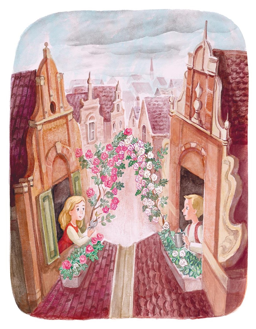 Обе семьи достали себе по большому деревянному ящику и разводили в них коренья для супа и зелень. Кроме того, в каждом ящике рос небольшой розовый куст; и кусты эти чудесно разрастались. Однажды родители решили поставить оба ящика на дно желобка, и тогда от окна одной семьи к окну другой протянулись как бы две цветочные грядки. Плети гороха свисали с ящиков зелёными гирляндами, ветви розовых кустов переплетались и обрамляли окна – казалось, это триумфальные арки из листвы и цветов. Ящики были очень высоки, и детям запрещали на них карабкаться, но родители часто позволяли мальчику с девочкой ходить друг к другу в гости и сидеть на скамеечке под розами. Как весело им было играть здесь!