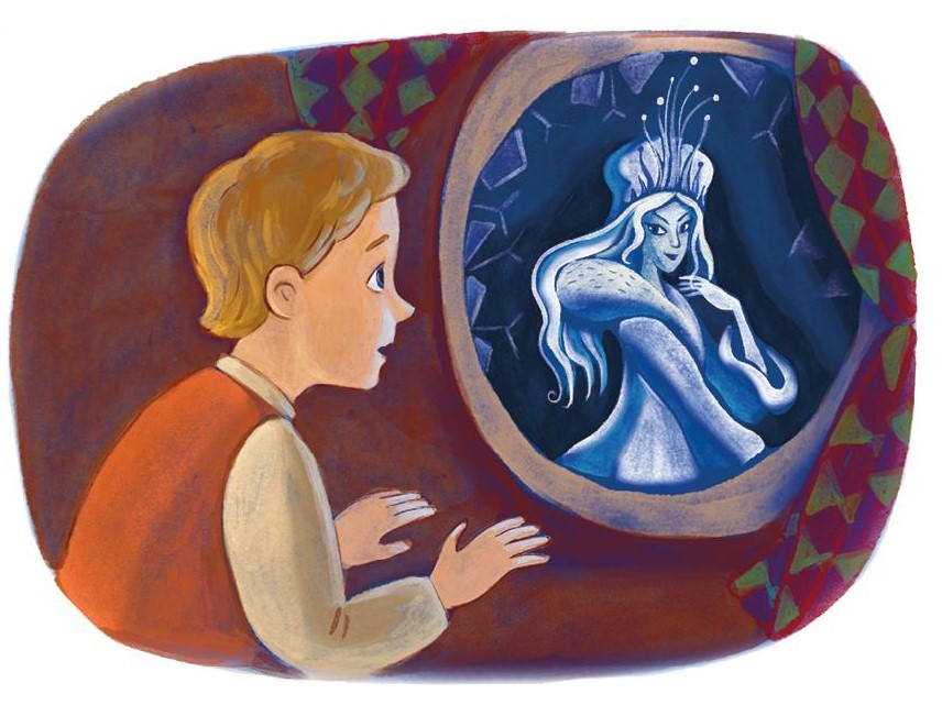 Кай взглянул на неё. Она была так хороша! Он и представить себе не мог более умного, более пленительного лица. Теперь она не казалась ему ледяною, как в тот раз, когда появилась за окном и кивнула ему головой, – теперь она представлялась ему совершенством. Он перестал её бояться и рассказал ей, что знает все четыре действия арифметики и да-же дроби, а ещё знает, сколько в каждой стране квадратных миль и жителей… Но Снежная королева только молча улыбалась. И вот Каю показалось, что он и правда знает слишком мало, и он устремил взор в бесконечное воздушное пространство.