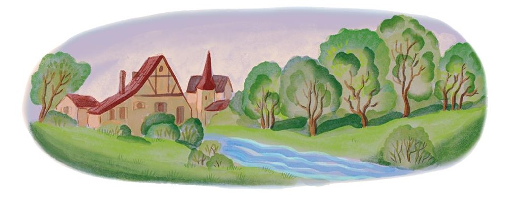 «Может быть, река несёт меня к Каю?» – подумала Герда и повеселела, потом встала на ноги и долго-долго любовалась красивыми зелёными берегами. Наконец она подплыла к большому вишнёвому саду, в котором приютился крытый соломой домик с необыкновенными красными и синими стёклами в окошках; у дверей его стояли два деревянных солдата и отдавали ружьями честь всем, кто проплывал мимо.