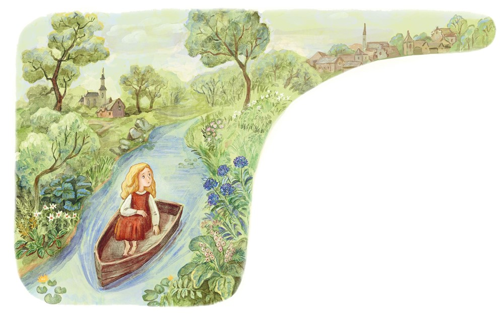 Лодку уносило всё дальше. Герда сидела смирно, в одних чулках – красные башмачки её плыли за лодкой, но не могли её догнать, лодка двигалась быстрее.