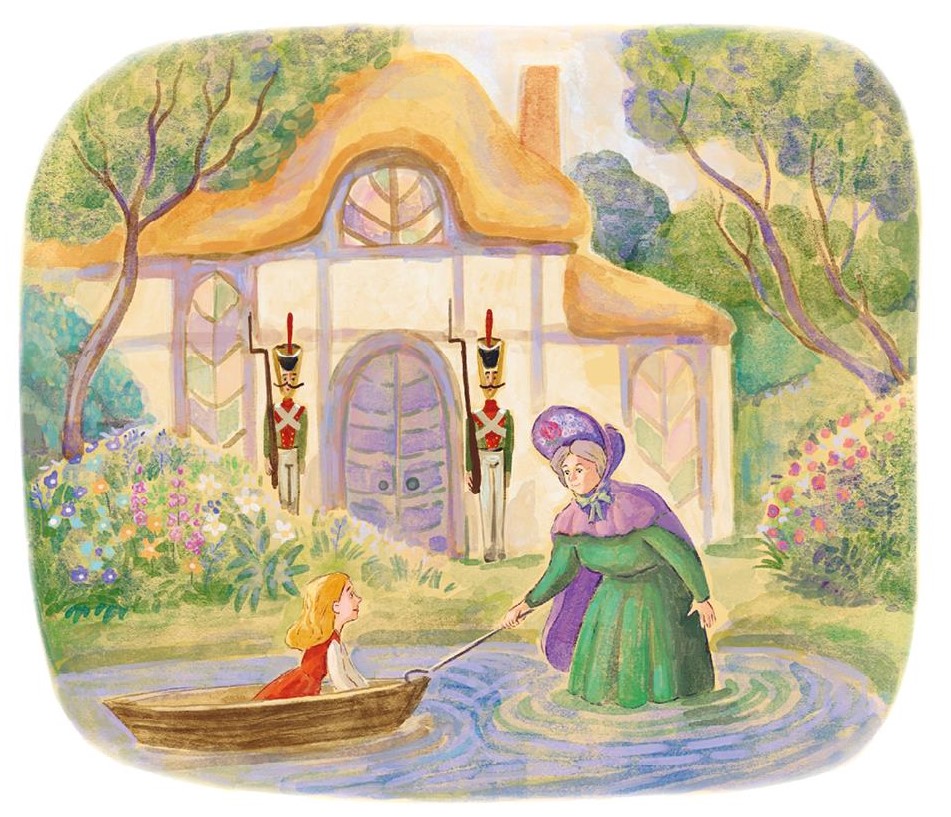 Тут старушка вошла в воду, зацепила лодку своей клюкой, притянула её к берегу и высадила Герду.