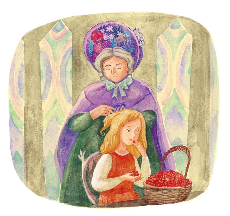 Окна были высоко от пола и все застеклены разноцветными – красными, голубыми и жёлтыми – стёклышками; от этого и сама комната была освещена каким-то удивительным радужным светом. На столе стояла корзинка со спелыми вишнями, и Герда могла лакомиться ими сколько душе угодно; и пока она ела, старушка расчёсывала ей волосы золотым гребешком. А волосы у Герды вились, и кудри золотым сиянием окружали её милое, приветливое личико, кругленькое и румяное, словно роза.