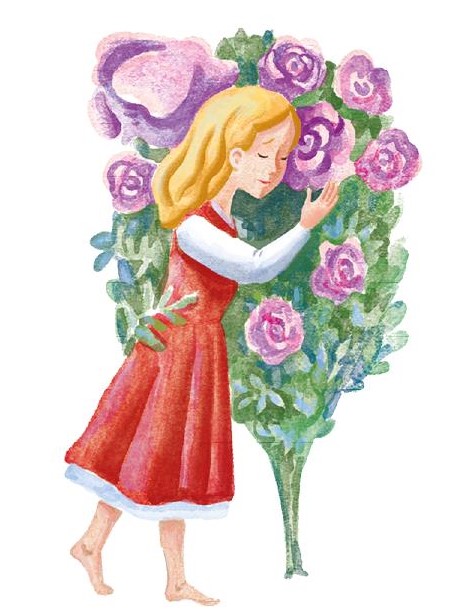 Тогда девочка опустилась на землю и заплакала. Тёплые слёзы её упали как раз на то место, где ещё недавно стоял розовый куст, и как только они смочили землю, мгновенно появился куст, усыпанный цветами, как и прежде. Герда обвила его ручонками, стала целовать цветы и вспомнила о тех великолепных розах, что цвели у неё дома, а потом и о Кае.