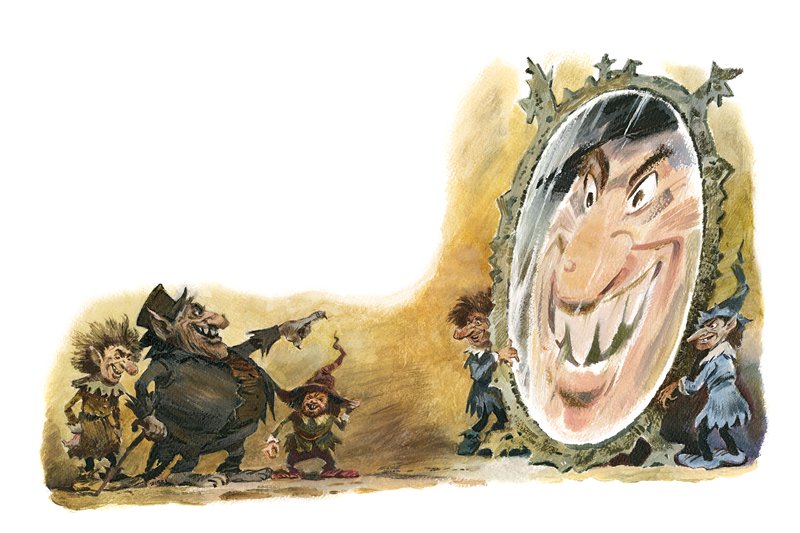 Ученики тролля – а он руководил школой магических наук – разнесли весть о зеркале как о настоящем чуде; они верили, что теперь можно увидеть, как на самом деле выглядит мир вокруг и люди в этом мире. Злые волшебники носились по всему свету с троллевым стеклом, и вот не осталось ни страны, ни человека, которые бы не отразились в нём. А потом ученики тролля вздумали подняться над землёй и поглумиться над ангелами и Господом.