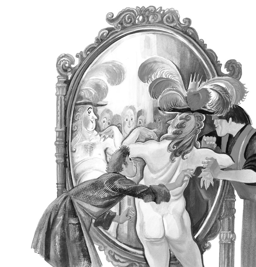 Король разделся догола, и обманщики принялись наряжать его: они делали вид, будто одну за другой подают ему разные принадлежности его нового туалета, потом – будто прикрепляют ему длинный шлейф. А король поворачивался во все стороны и вертелся перед зеркалом.